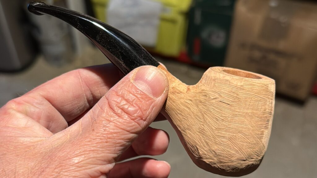 Here is the pipe ‘finished’. I won’t lie, my-newness and excitement to finish probably led to a bit of rushing as I feel the shape is a bit clunky still and could have been refined to be a bit sharper, and there are a lot of tool marks still visible. Overall though, I’m very happy to have a piece that was carved myself and actually smoked pretty well!